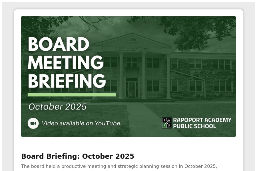 Board Briefing: October 2025 The board held a productive meeting and strategic planning session in October 2025, focusing on key district operations, improvement plans, and financial oversight. . . .