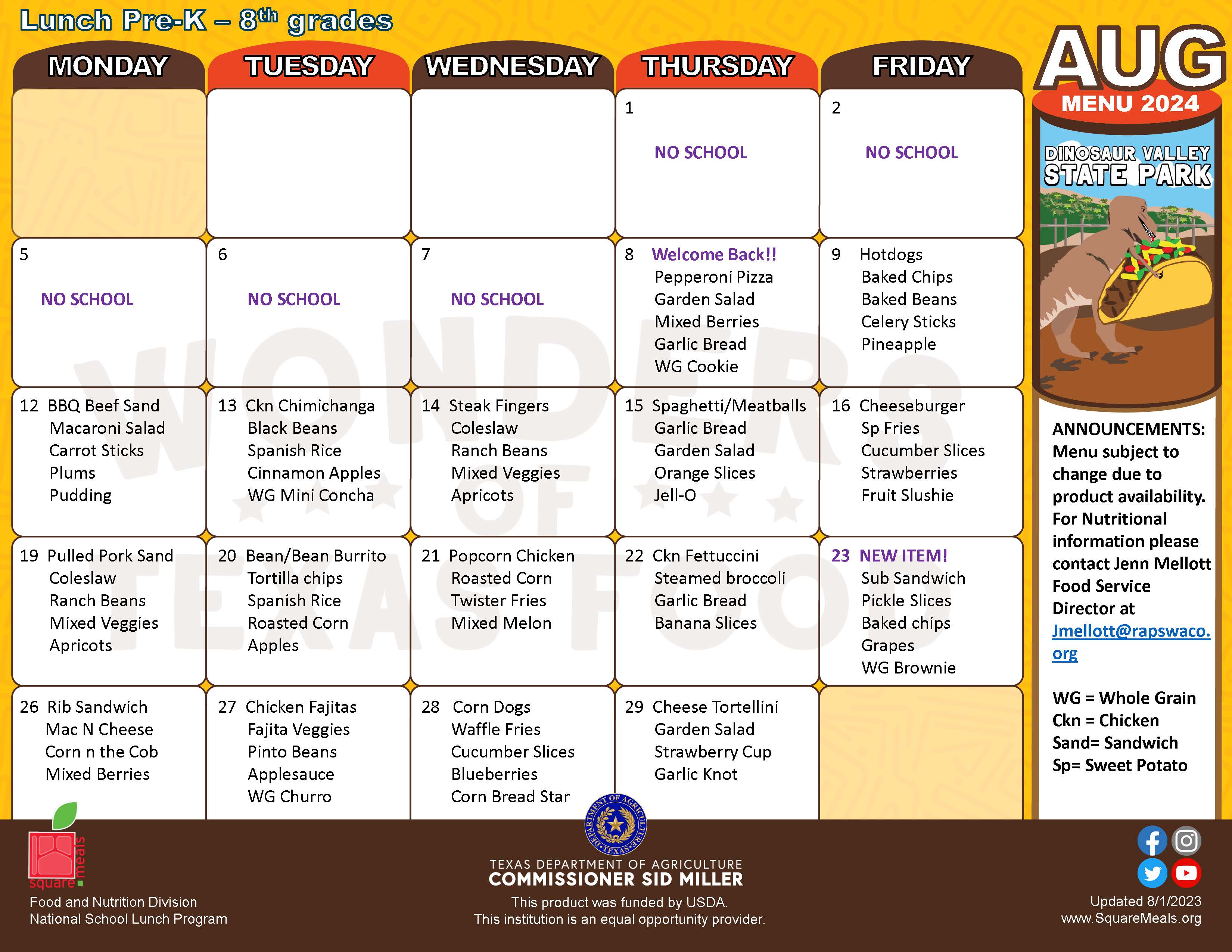 Tuesday, August 20, 5 pm - School Board Meeting Tuesday, August 27, 9 am - Parent Pop-In at Primary Campus (Pre-K-1st grade) Tuesday, August 27, 5:30 pm - Parent Pop-In at Elementary Campus (2nd-4th grade) Monday, September 2 - NO SCHOOL - Labor Day Thursday, September 5, 5:30 pm - Pre-K Open House Thursday, September 26, 5-7 pm - Rock the Block (Back to School Bash) Friday, September 27 - School Picture Day |