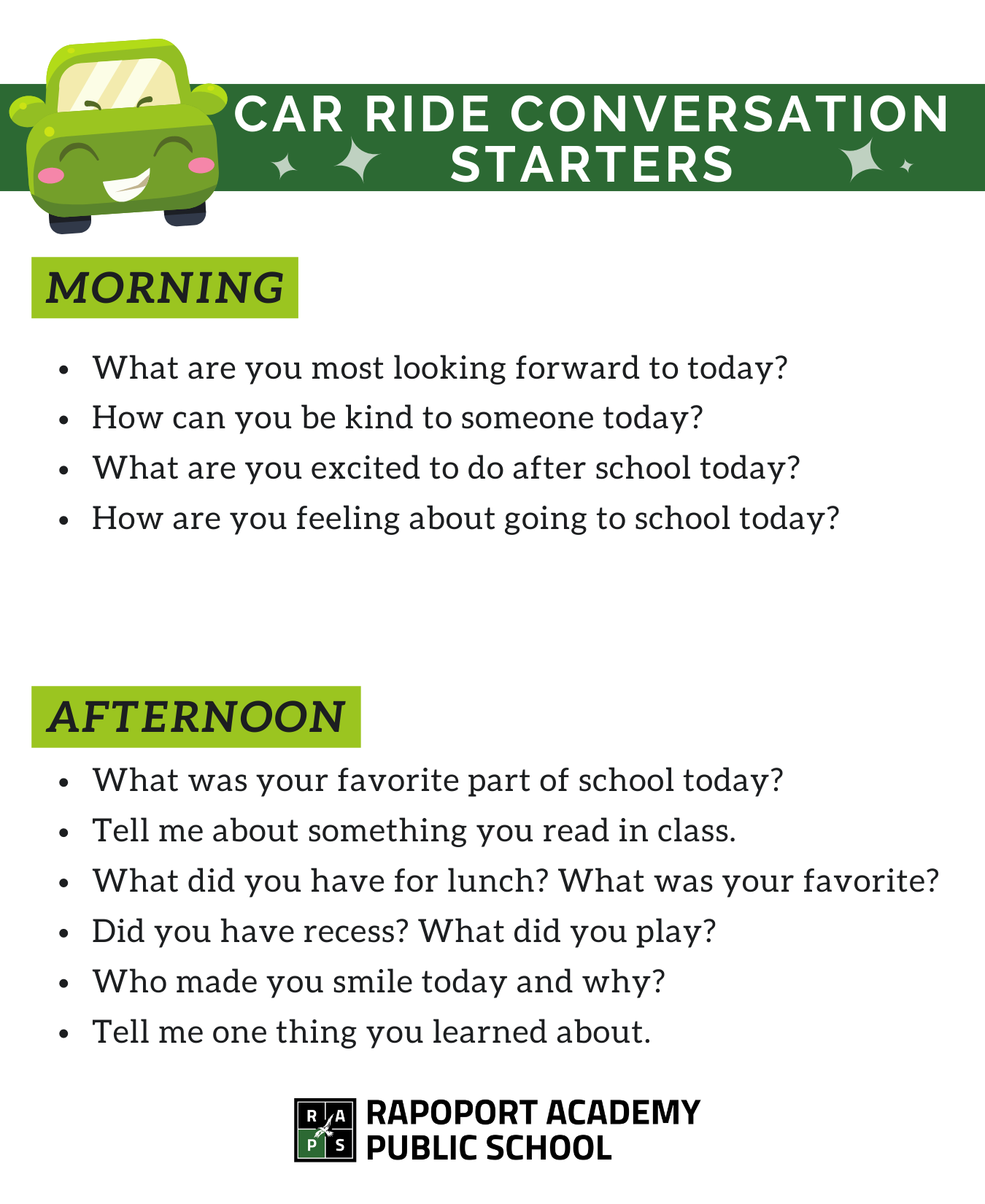 Tip of the Week - Car Ride Conversations Here are some great conversation starters with your child in the morning or afternoon. I hope this starts some great conversations with things your child shares with you.